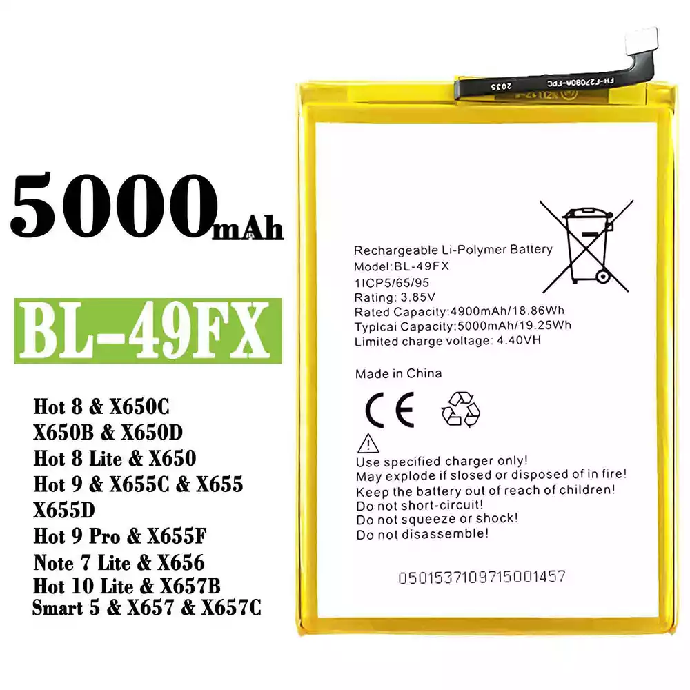 Batterie BL-49FX pour Infinix Hot 8 / X650C / X650B / X650D /Hot 8 Lite / X650 / Hot 9 / X655C / X655 / X655D / Hot 9 Pro / X655F / Note 7 Lite / X656 / Hot 10 Lite / X657B / Smart 5 / X657 / X657C