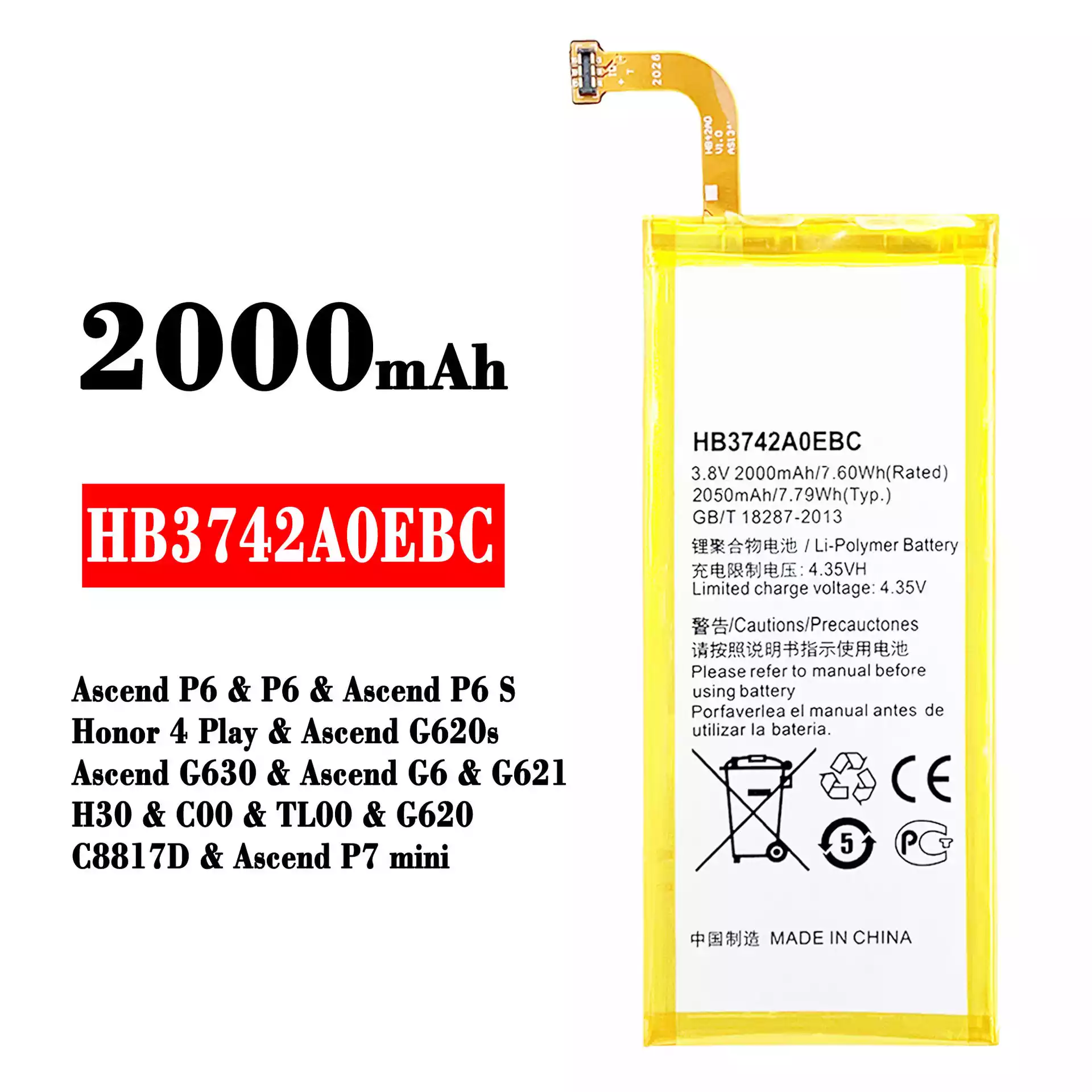 Batterie HB3742A0EBC pour HUAWEI Ascend P6 / P6 / Ascend P6 S / Honor 4 Play / Ascend G620s / Ascend G630 / Ascend G6 / G621 / H30 / C00 / TL00 / G620 / C8817D / Ascend P7 mini